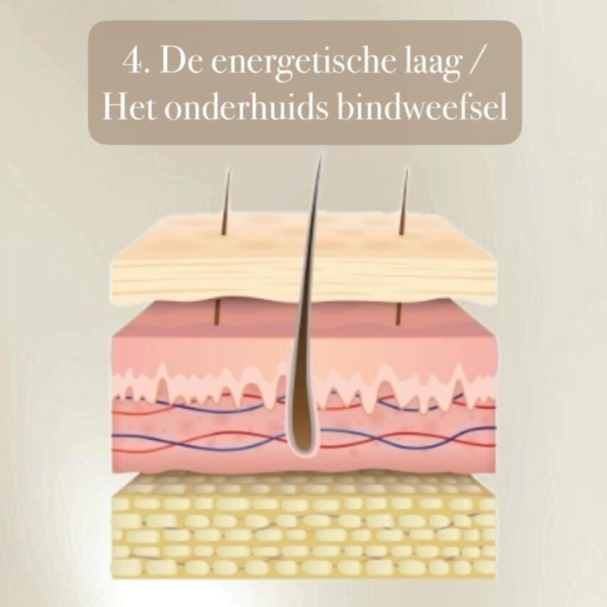 Maar deze laag doet méér dan dat. Hier huist je levensenergie, de kracht die je van binnenuit doet stralen. In het onderhuids bindweefsel voel je wat er zich onder de oppervlakte op energetisch niveau afspeelt. Soms sla je hier spanning, emoties of oude patronen op die je energie kunnen blokkeren. En wat doet deze 4e laag? Die spreekt dat uit en vindt haar weg naar de oppervlakte. Ze laat zien waar het stroomt en waar het stokt. Is er iets wat je mag loslaten? Wat houdt je nog vast? Wanneer je luistert naar die subtiele signalen, wijst je huid je vanzelf de weg terug naar ontspanning, balans en kracht. Mooi hè!